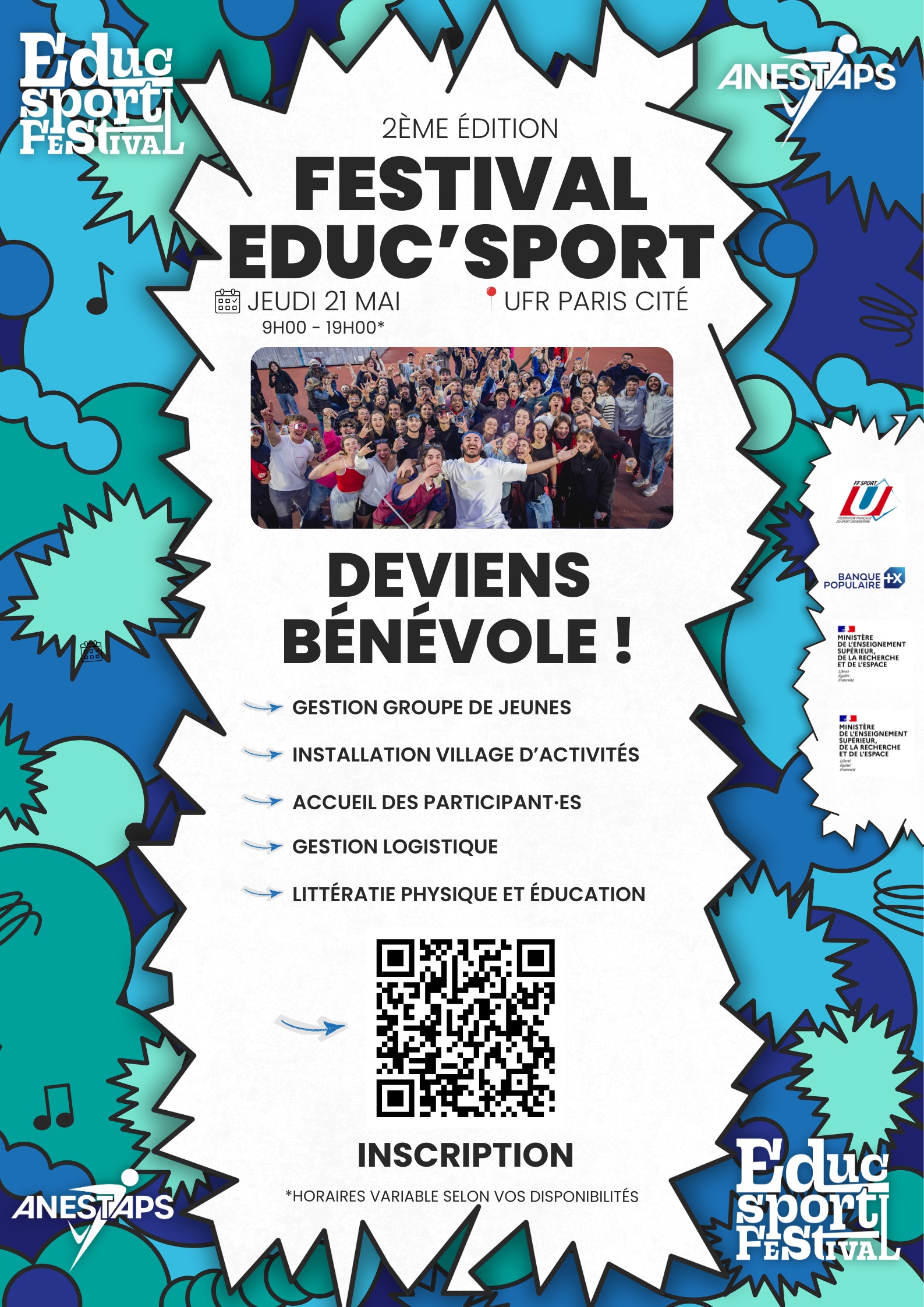 Le 21 mai 2026 se déroulera le Festival Educ Sport organisé par l’ANESTAPS au sein de notre UFR dont tu pourras devenir bénévole !